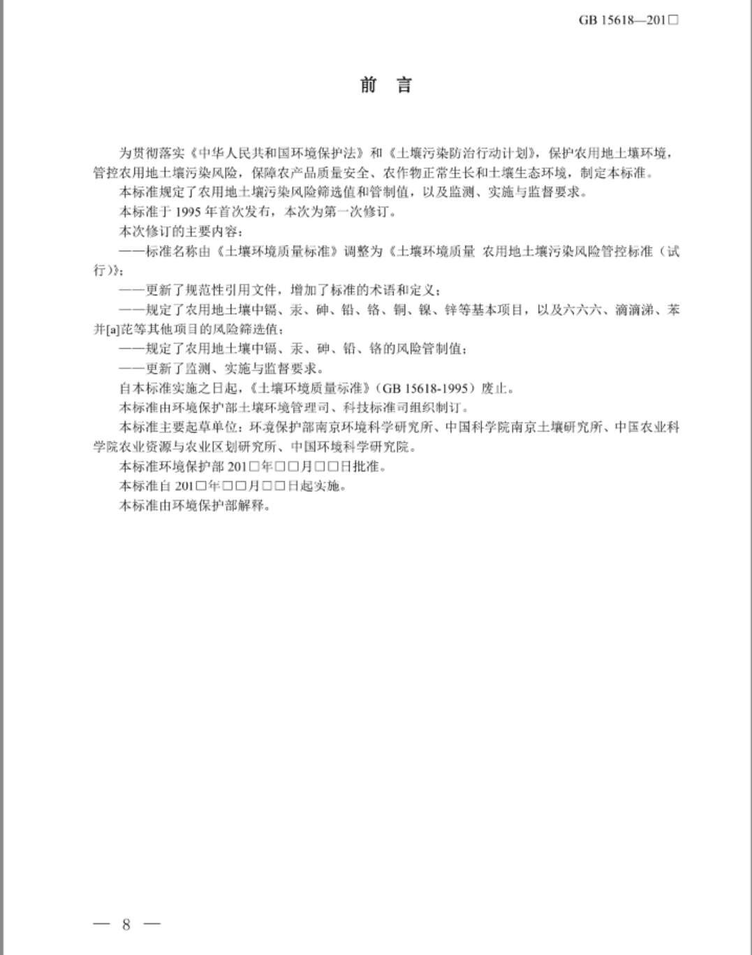 本标准由环境保护部土壤环境管理司、科技标准司组织制订。本标准主要起草单位:环境保护部南京环境科学研究所、中国科学院南京土壤研究所、中国农业科学院农业资源与农业区划研究所、中国环境科学研究院。