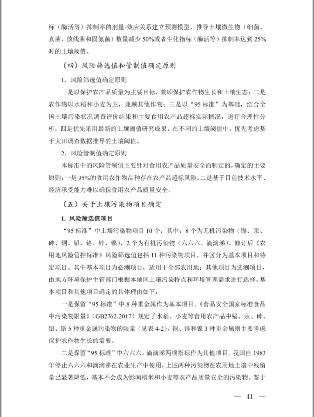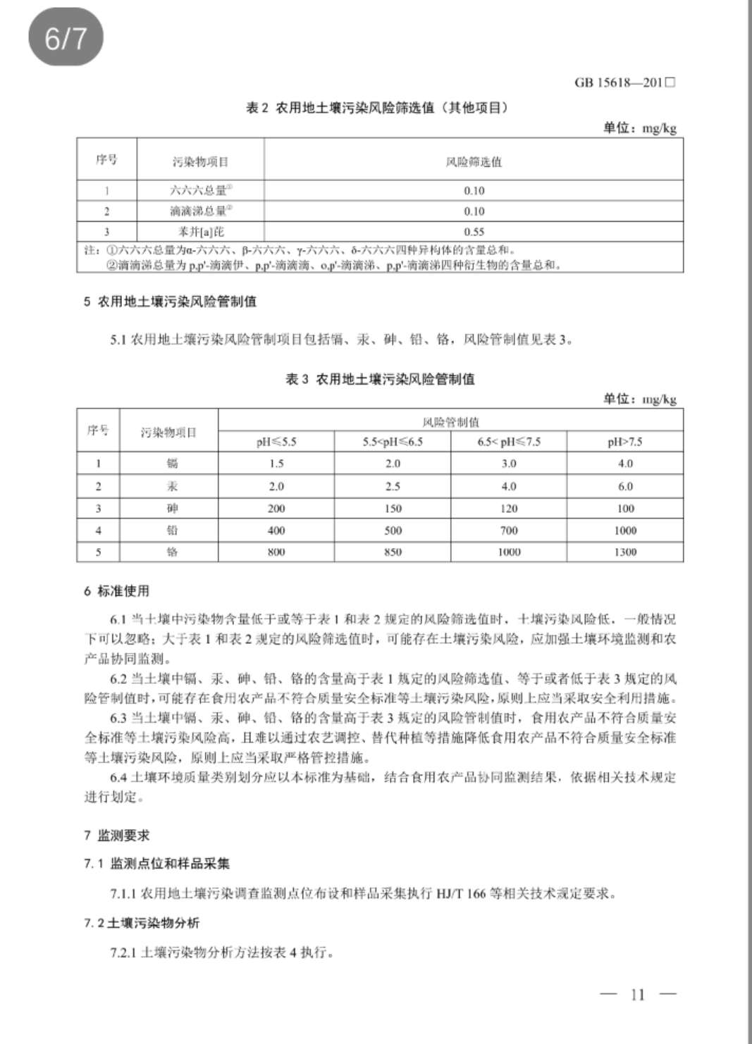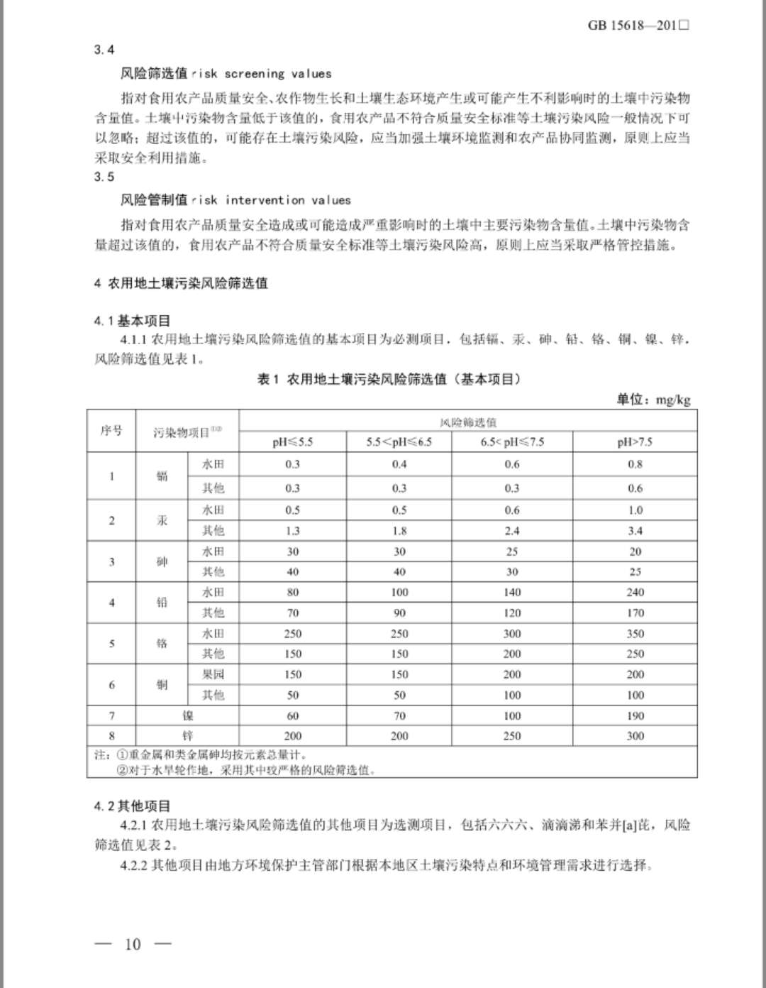 ——规定了农用地土壤中镉、汞、砷、铅、铬、铜、镍、锌等基本项目,以及六六六、滴滴涕、苯并[a]芘等其他项目的风险筛选值;