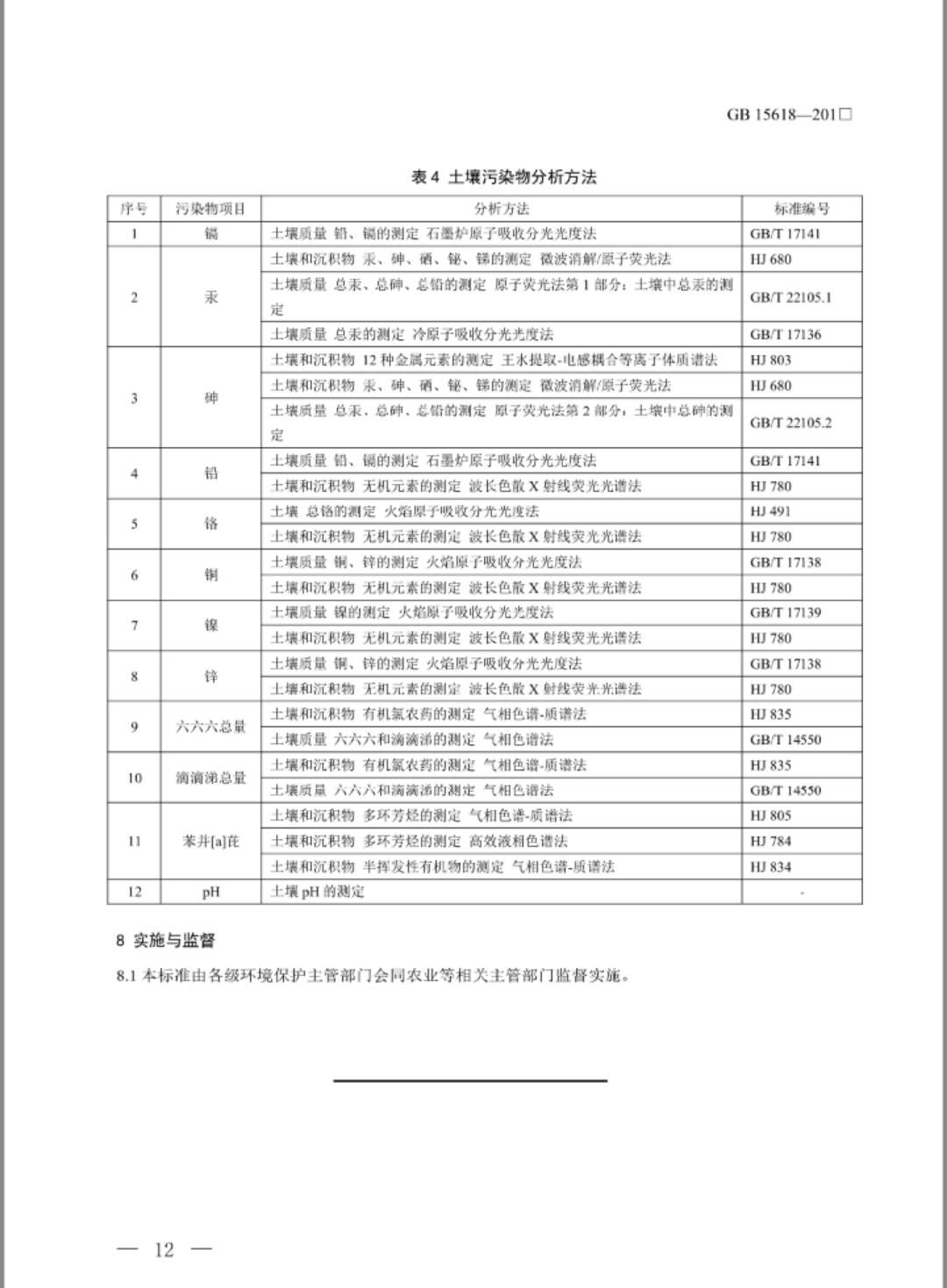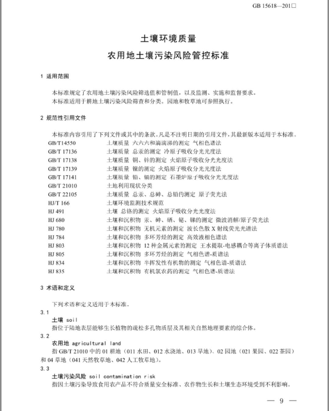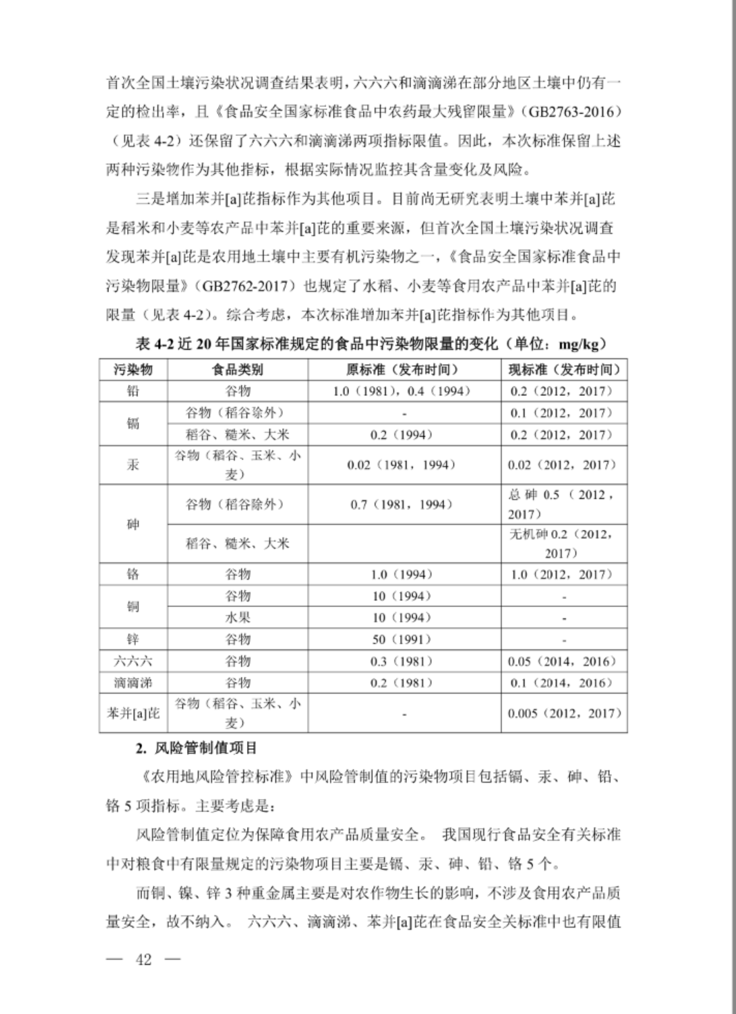——规定了农用地土壤中镉、汞、砷、铅、铬、铜、镍、锌等基本项目,以及六六六、滴滴涕、苯并[a]芘等其他项目的风险筛选值;