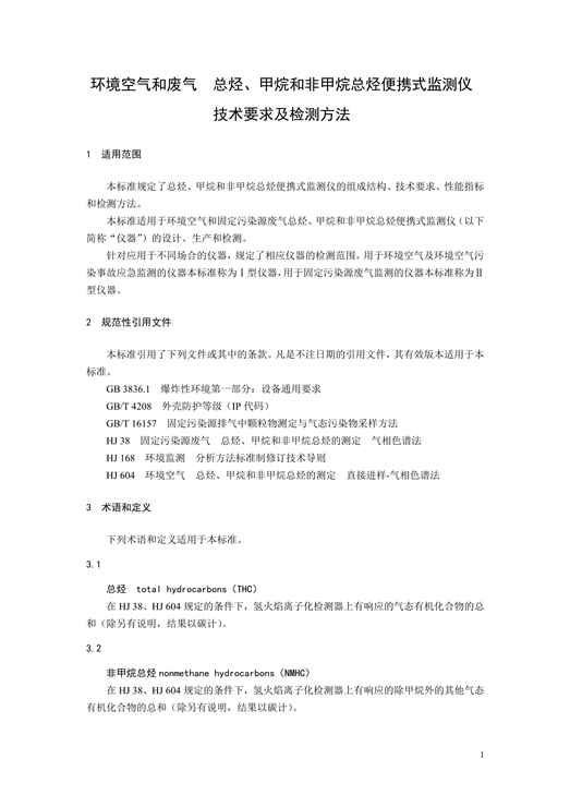 本标准适用于环境空气和固定污染源废气总烃、甲烷和非甲烷总烃便携式监测仪(以下简称“仪器”)的设计、生产和检测。针对应用于不同场合的仪器,规定了相应仪器的检测范围。用于环境空气及环境空气污染事故应急监测的仪器本标准称为Ⅰ型仪器,用于固定污染源废气监测的仪器本标准称为Ⅱ型仪器。