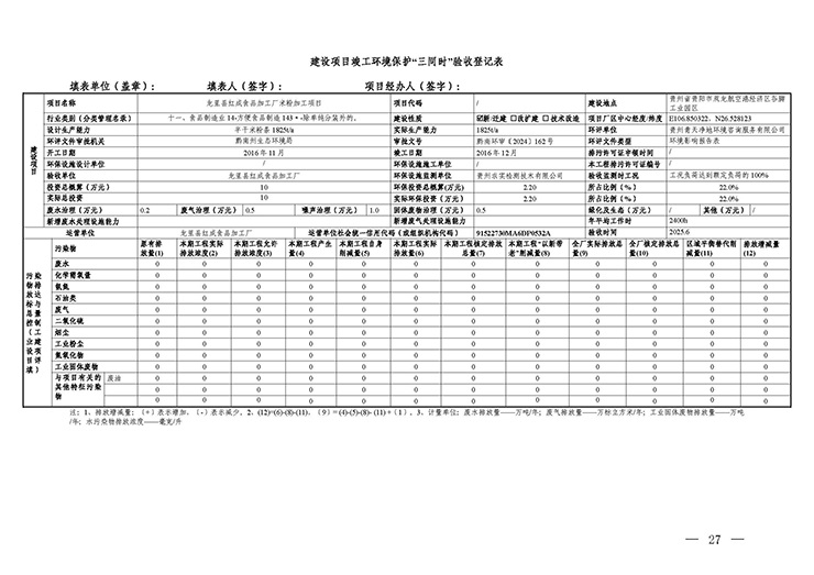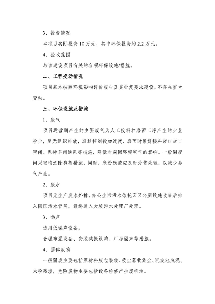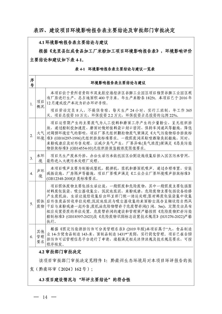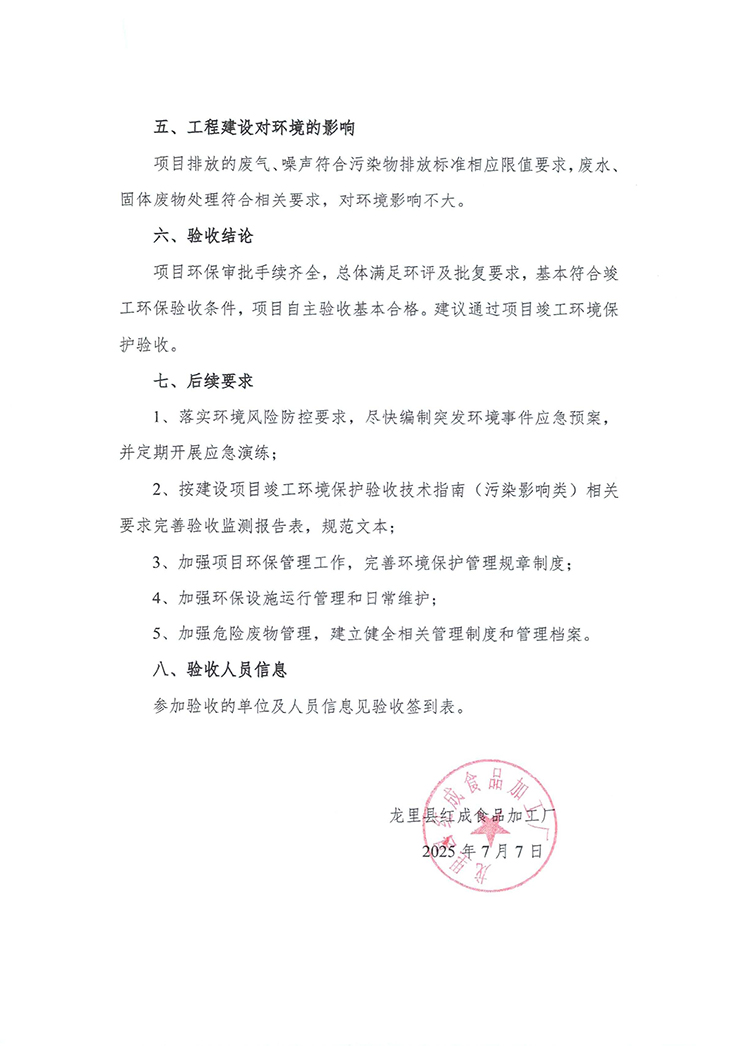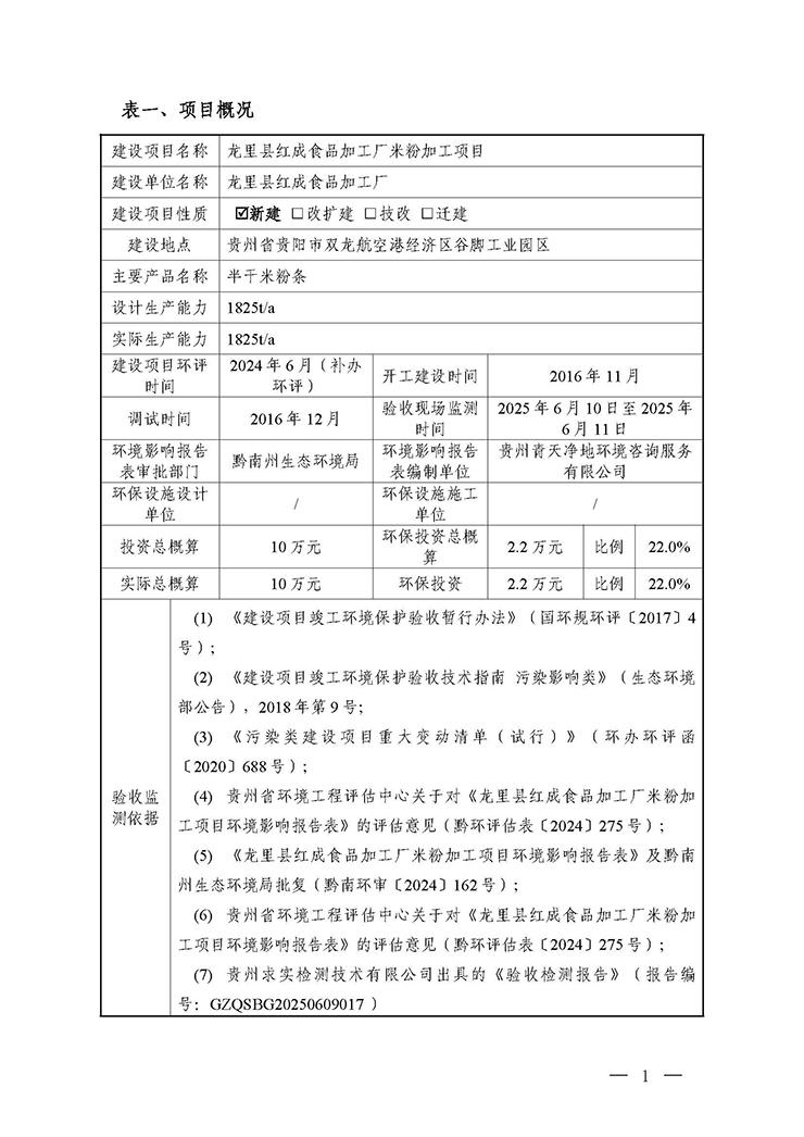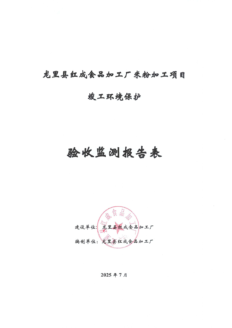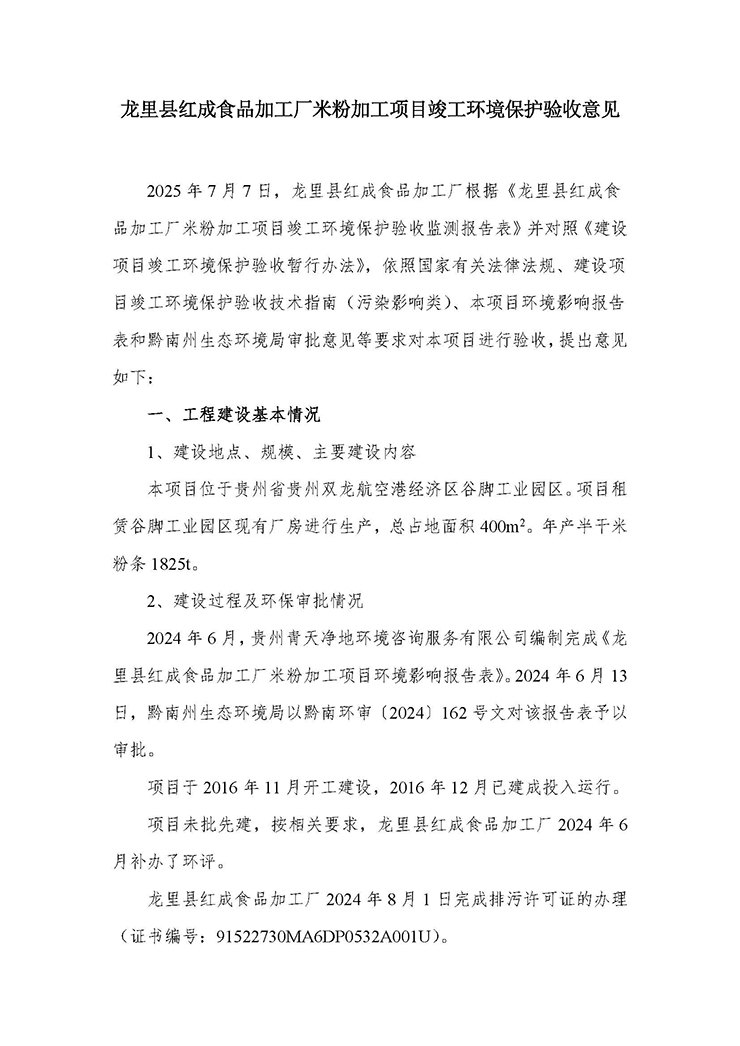 根据《国务院关于修改<建设项目竣工环境保护管理条例>的决定》(国务院令第682号),以及环保部《关于发布<建设项目竣工环境保护保护验收暂行办法>的公告》(国环规环评[2017]4号),现将《龙里县红成食品加工厂米粉加工项目竣工环境保护竣工环境保护验收监测报告》公示如下: 项目名称:龙里县红成食品加工厂米粉加工项目 建设单位:龙里县红成食品加工厂 公示内容:验收调查报告,验收意见 公示时间:2025年7月8日-2025年8月4日 公示期间:对上述公示内容如有异议,请以书面形式反馈,个人须署真实姓名,单位须加盖公章 联系人:唐红成 联系电话:13984899483 验收报告公开载体:网络公示。