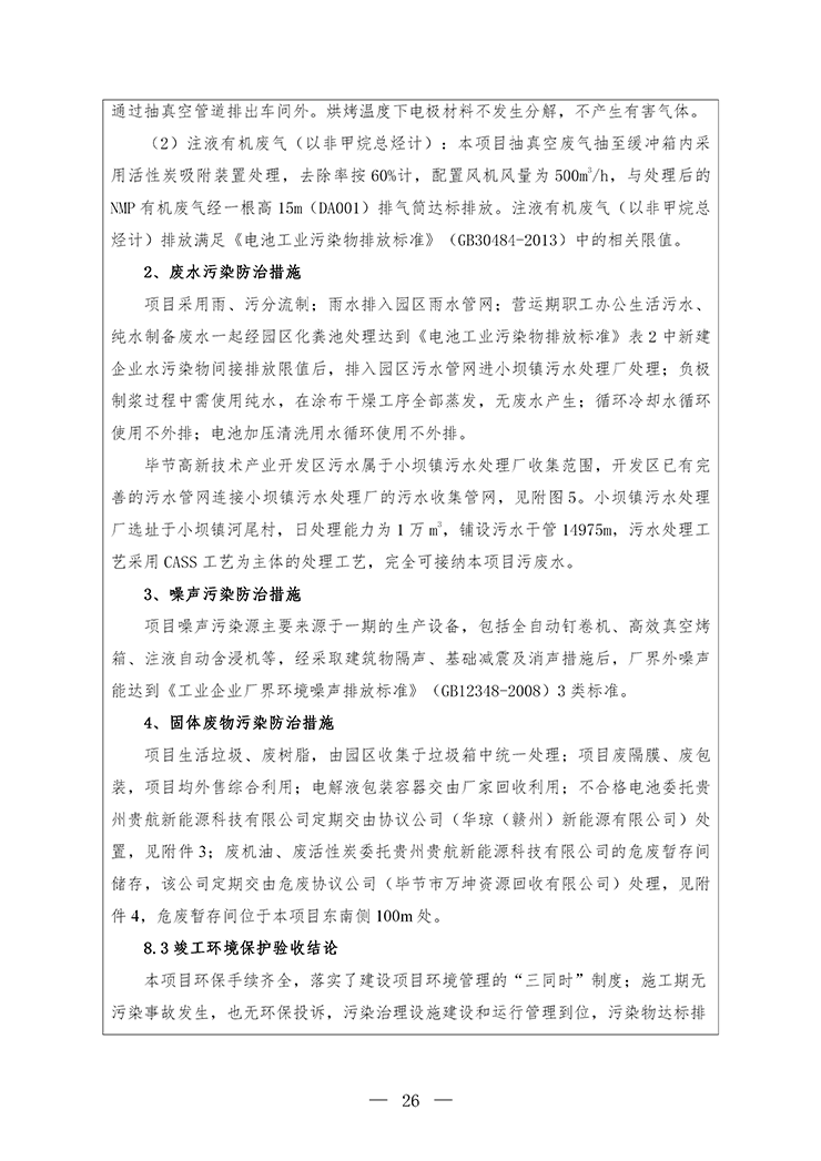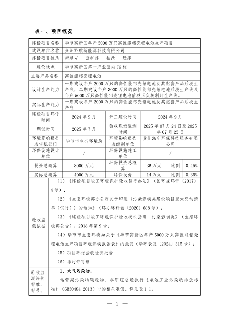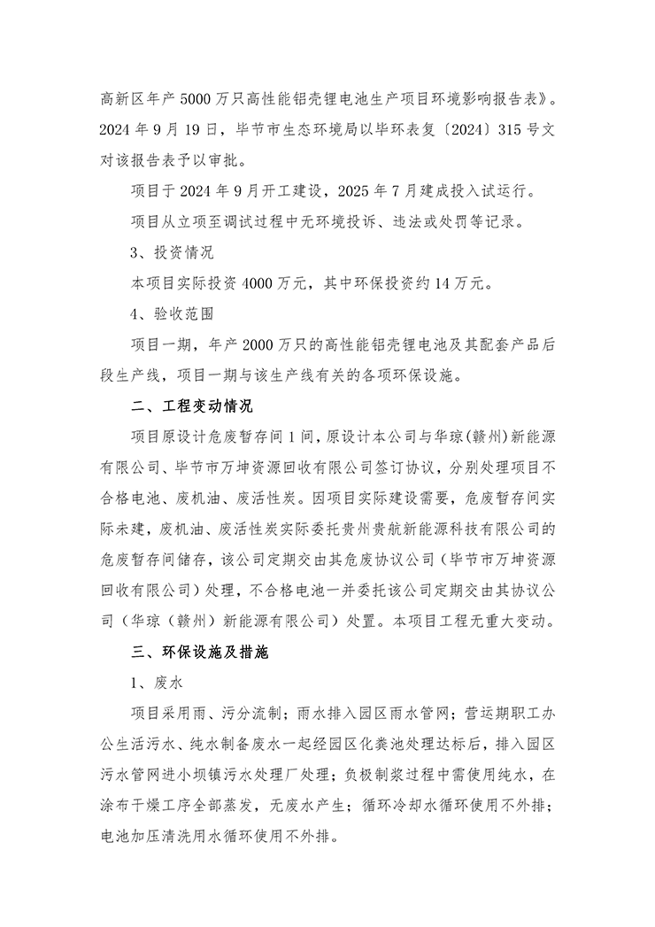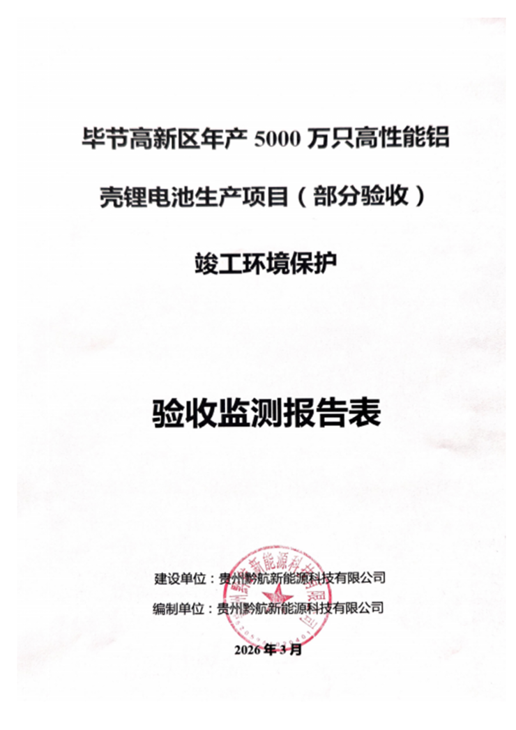 项目名称:毕节高新区年产5000万只高性能铝壳锂电池生产项目(部分验收)