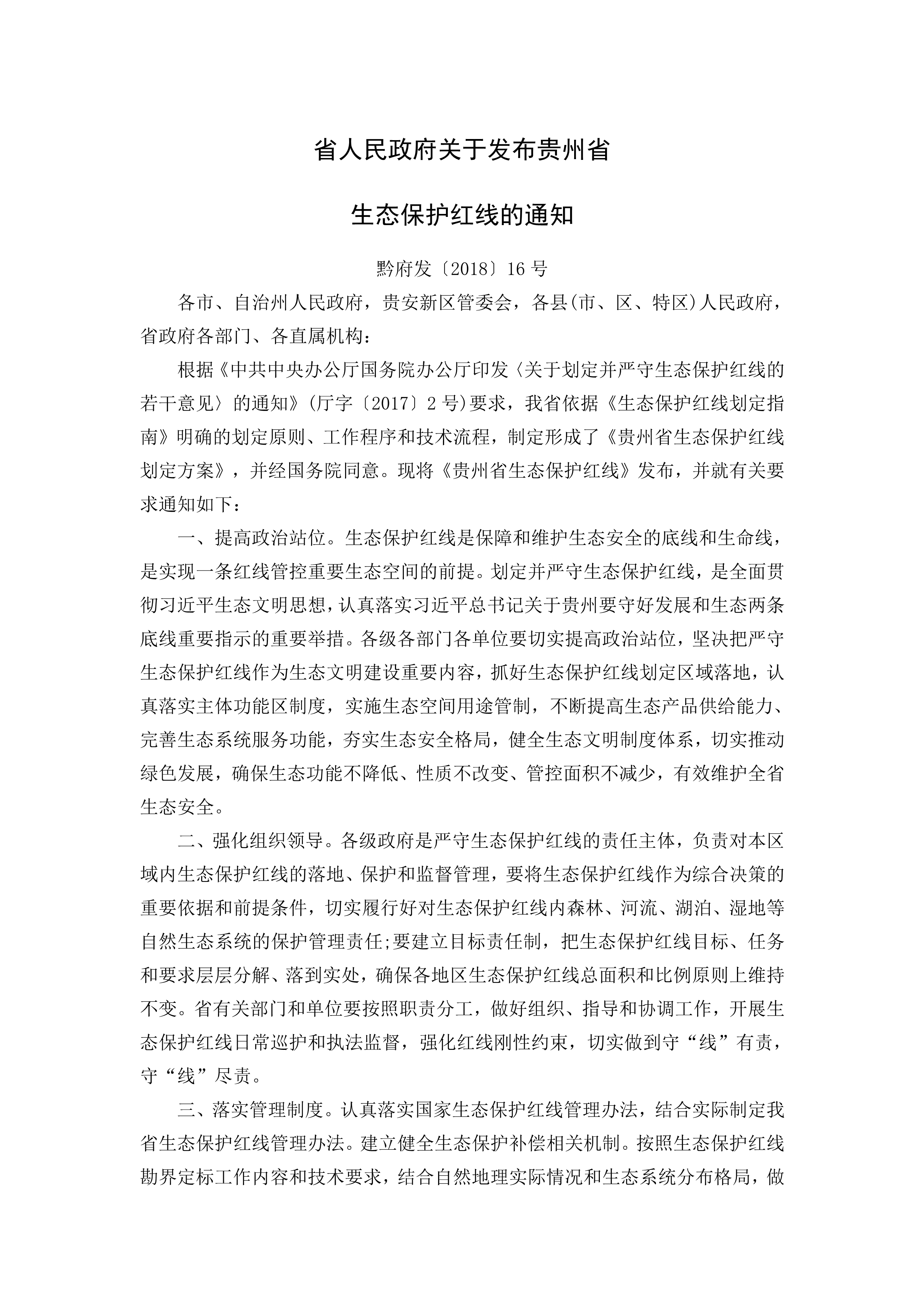 根据《中共中央办公厅国务院办公厅印发〈关于划定并严守生态保护红线的若干意见〉的通知》(厅字〔2017〕2号)要求,我省依据《生态保护红线划定指南》明确的划定原则、工作程序和技术流程,制定形成了《贵州省生态保护红线划定方案》,并经国务院同意。现将《贵州省生态保护红线》发布,并就有关要求通知如下: